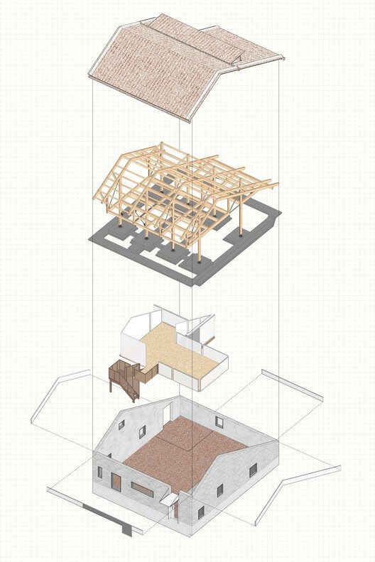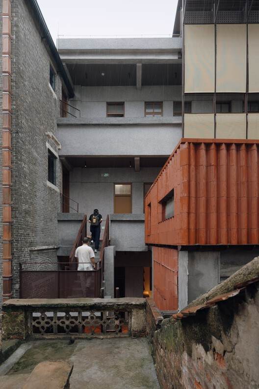 Building 3 had the doors and windows between the original frame columns removed, opening up the internal space to connect with the external courtyard. The original reinforced concrete beams, slabs, and columns were reinforced to allow the roof to bear more people and activities. The staircase, which acted as a visual counterpart to the courtyard, was preserved through the efforts of the designers and constructors, continuing to be a visual focal point for the entire area after reinforcement.