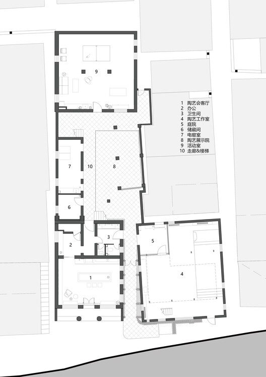 轻介入的公共空间叙事系统:建筑师通过在建筑群之间植入一套由陶砖和钢架构成的“新流线系统”,巧妙地整合了原有的内院、露台和新增的屋顶空间。这套系统不仅清晰地界定了导向、会客、工作室等功能分区,更以轻盈、可替换的方式(如钢架加膜装置)激活了户外核心公共区域。这种手法既尊重了场地原有的场所精神,又以现代的、具有强烈“陶”主题视觉指向性的设计语言,完成了对沉寂街区的有效激活和视觉提升。
