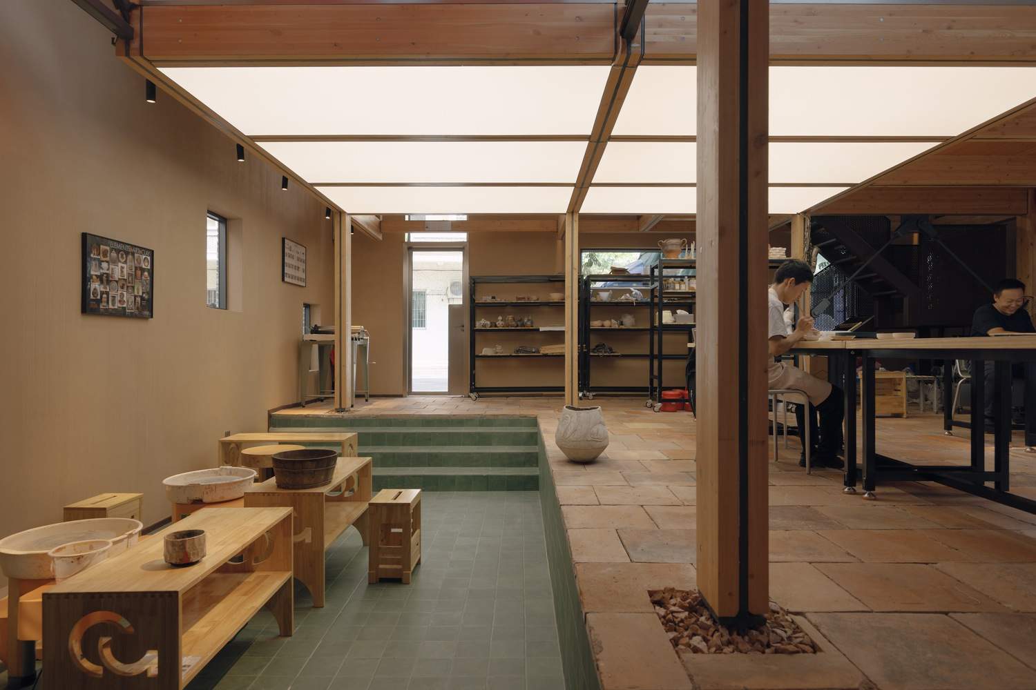 改造前的现场条件与陶艺工作室的功能定义存在较大冲突,因此改造过程中结构构件被最大程度的集约化了,以保证底部空间自由灵活,尺度适宜艺术创作。原场地的高差关系则被保留下来,成为工作室中功能灵活可变的区域。