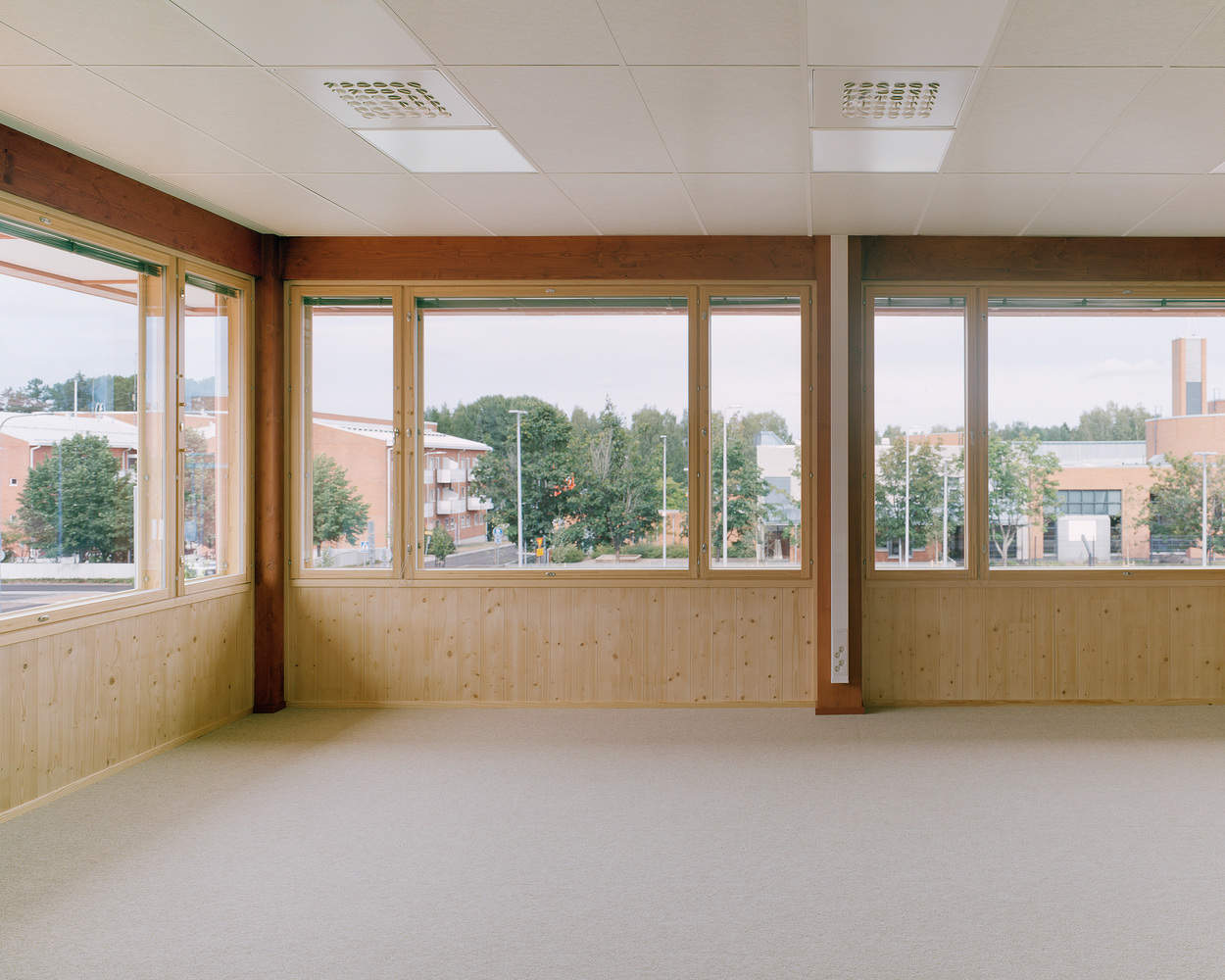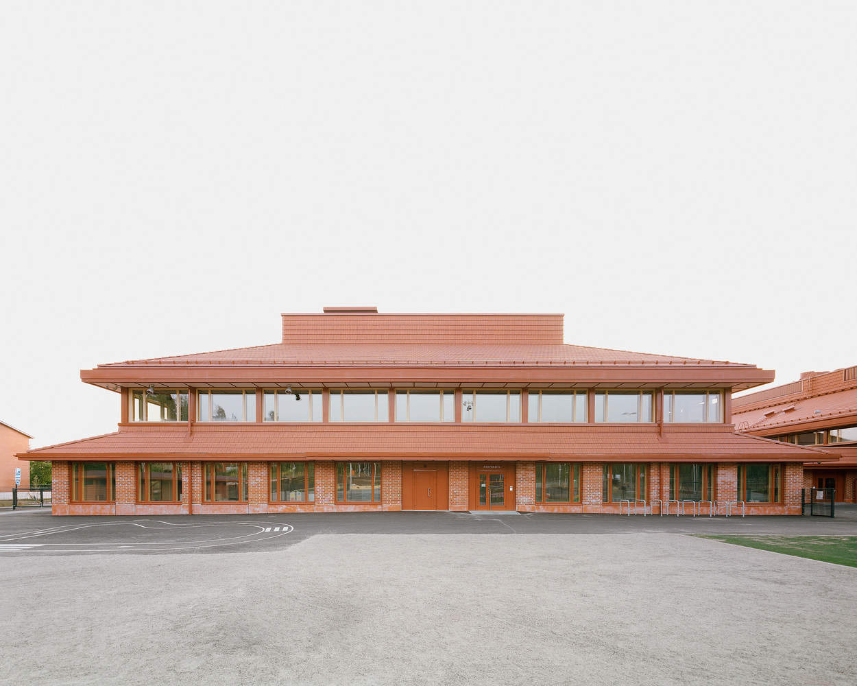 The material palette of Sammontalo primarily merges two tones: brick red and natural wood color. The brick red defines public areas such as lobbies, the library, and corridors, lending them warmth and character, while light wood dominates the quieter learning spaces. The color scheme seamlessly continues from exterior to interior, with extensive use of wood—much of it stained semi-transparent red—creating a unified and pleasant atmosphere. These elements together give Sammontalo its distinct architectural character and an enduring harmony between form, material, and place.