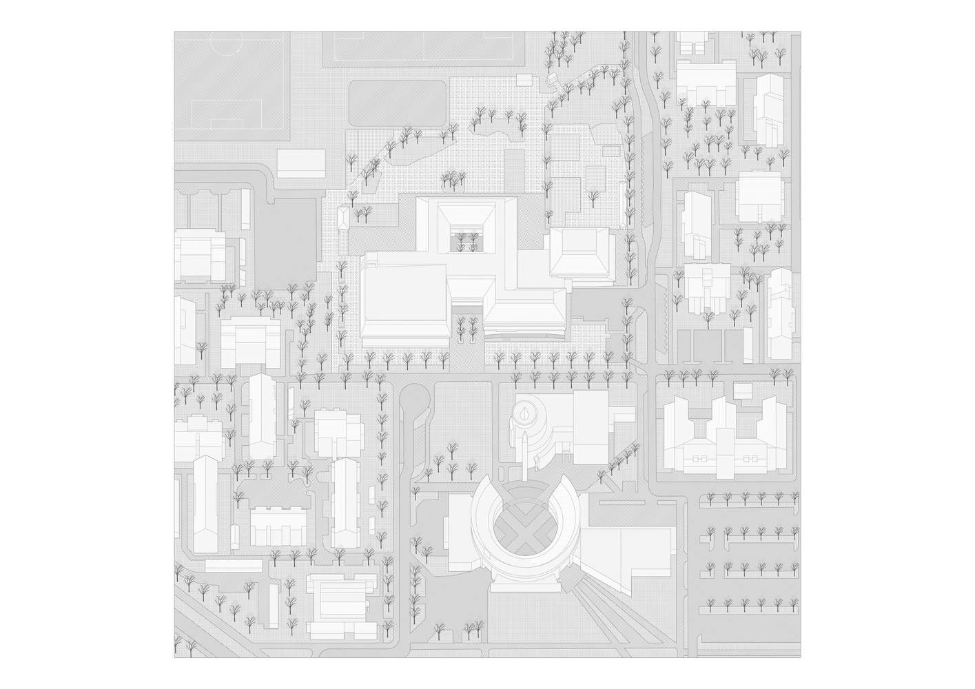 Despite its large scale, the complex is divided into several smaller, more human-scaled units that harmonize naturally with the proportions of the surrounding buildings. The double-layer facade emphasizes horizontal lines: the heavy brick columns on the ground floor form a solid base, while the continuous ribbon windows and slender post-and-beam structure make the upper level appear light and transparent, like a pavilion. The sloped brick-tiled roof and continuous double eaves give the building a distinct and unified silhouette in the urban landscape.