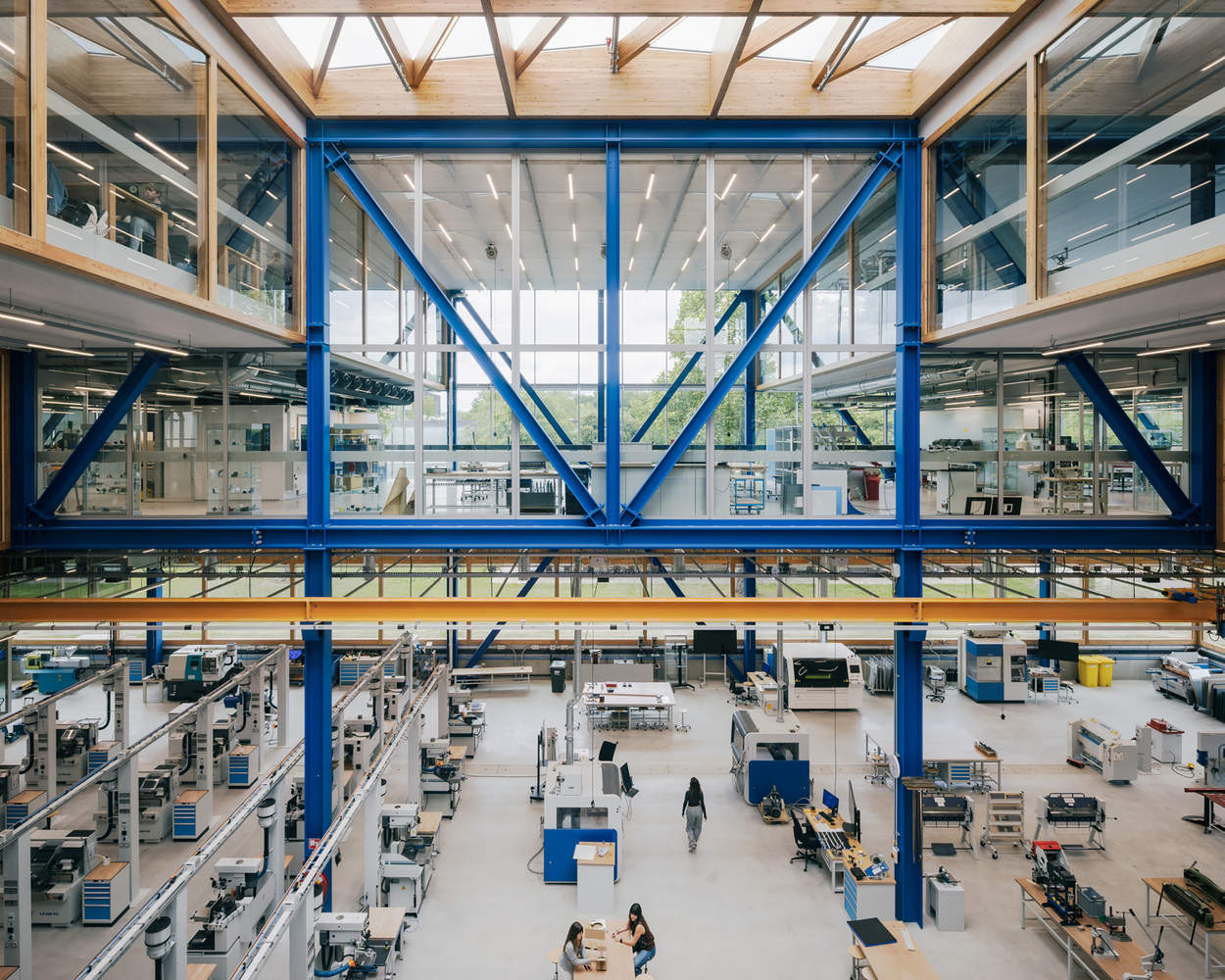 卓越的功能性。建筑放大了其功能性,这一原则贯穿于每一个细节之中。结构节点经过无数次优化,围栏、楼梯和立面设计精细至极。材料调色板简单明了,与功能相契合。钢桁架提供大跨度,涂有防火蓝色以强调空间结构;浅灰色地板和回收 PET 天花板增添宁静与光线反射;玻璃隔断最大限度地实现视觉连接。这一坚固的基础通过内外两侧的落叶松框架得到补充,增添了温暖感。CLT 核心筒进一步强化了这一点。外露的设施经过精心设计,为建筑增添了技术特色。整座建筑都散发着“工程技术”的气息。