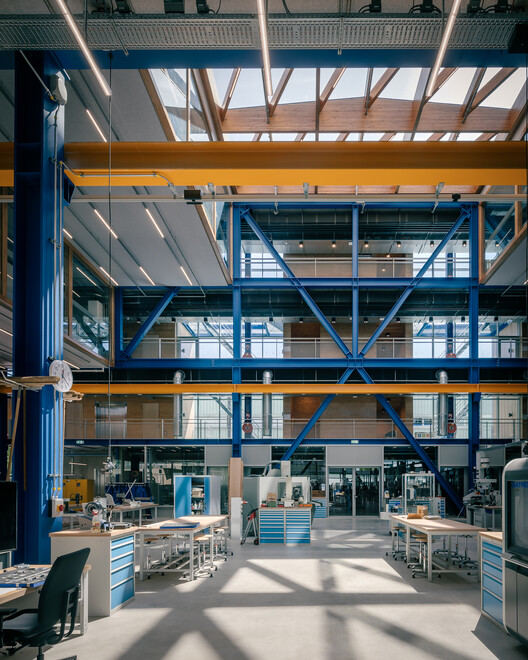From the architect. The CUBE project, a cascading workshop building for the Faculty of Engineering Technology at the Drienerlo campus of the University of Twente, is now complete, featuring a total floor area of 4734 m². CUBE, a joint design by Civic Architects, VDNDP, and Studio Groen+Schild, and constructed by WAM&VanDuren Bouwgroep with WSi Techniek, acts as a compact extension to the Horst ensemble, housing stacked workshops, offices, and flexible laboratory spaces.