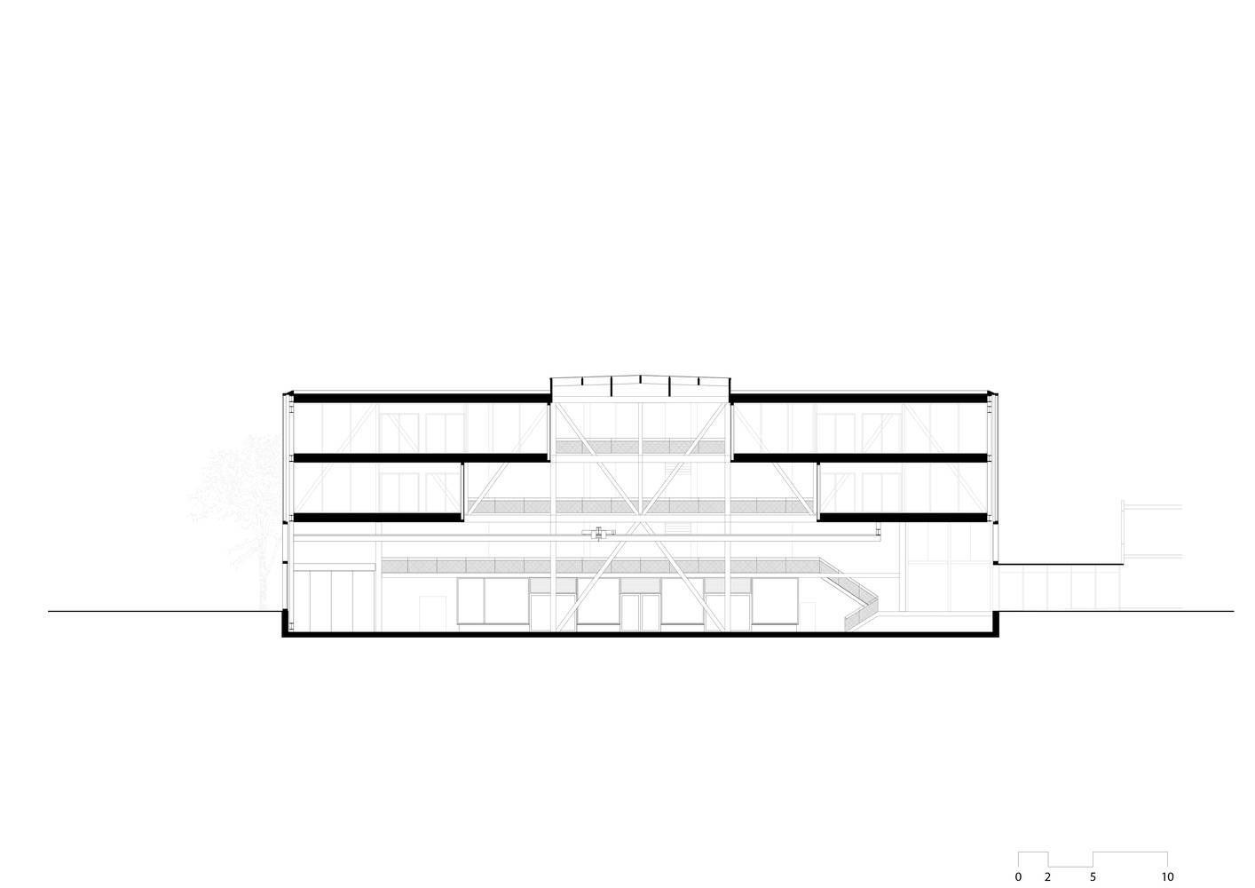 功能性与互动性。过去,研究需要独立,而如今,创新则围绕合作展开。CUBE 通过融合功能性与互动性来回应这一变化。大楼内设有五个车间——焊接、金属加工、模型制作和装配车间——以及约 500 平方米的实验室和测量空间。这些空间采用层叠式布局,而非并排排列,从而保持了紧凑的占地面积、便捷的通行路线以及空间之间的最佳视觉联系。金属车间位于下沉的底层。办公室位于南侧,略高以便于监督。上方三层设有空气处理设备。焊接车间位于右侧,而物流入口则位于北侧,方便卡车和叉车进出。二层是装配和模型车间,三层则是实验室。通行空间、服务核心和储藏室位于东侧,作为“主干”为可自由配置的车间提供支持。从这里,可以俯瞰大型开放空间。一个金字塔形中庭引入充足的自然光,并在视觉上连接各楼层。工作过程随处可见,仿佛掀开了学院的面纱。