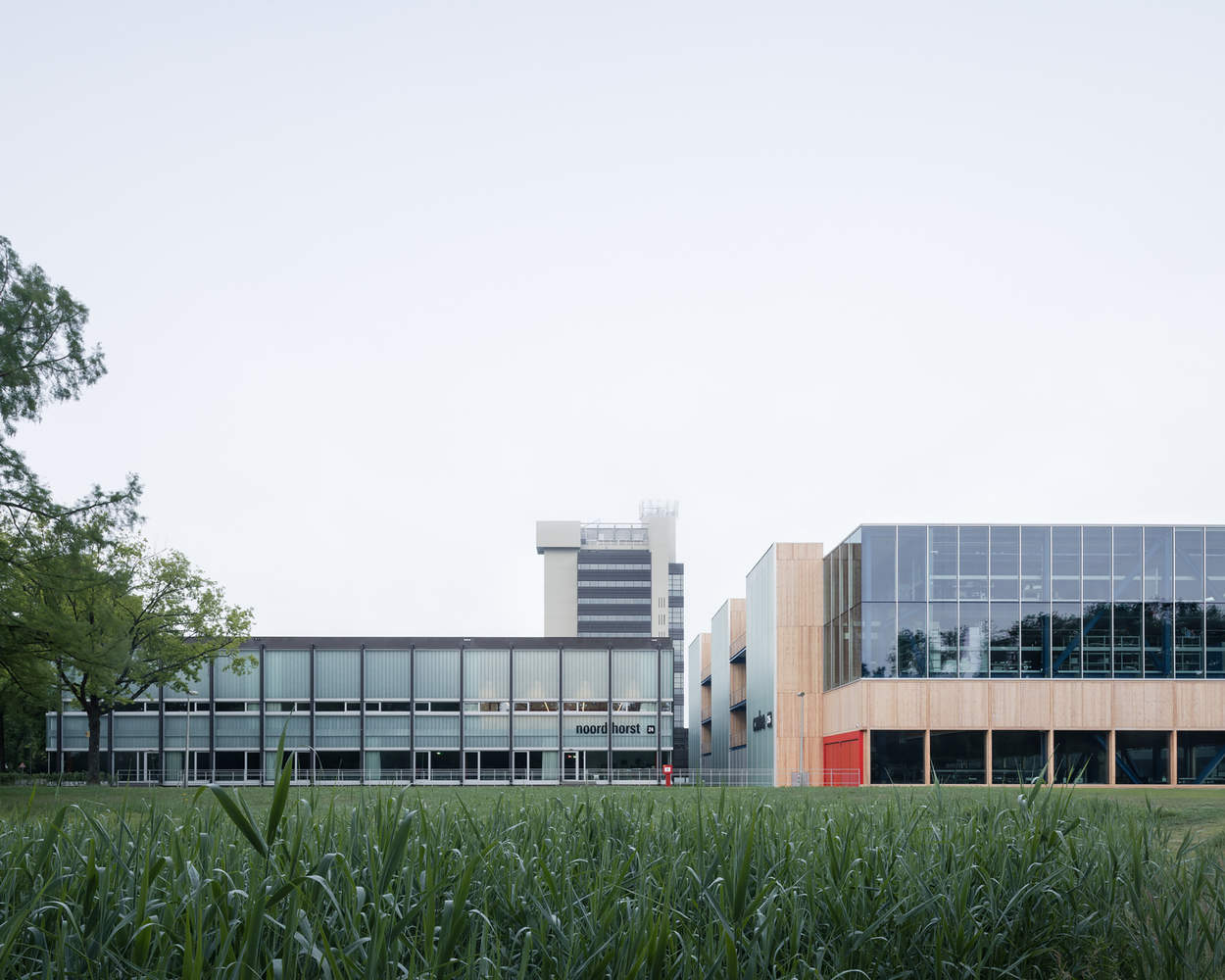 Machine in the landscape. The Horst ensemble is one of the jewels of the University of Twente campus. Designed by Dick van Mourik in the 1960s, Horst is a modernist complex of low courtyards, towers, and satellite buildings. The new extension interprets this style in a contemporary way while retaining the original architectural language. CUBE is designed as a new satellite building. Because the site was too small to meet the program requirements, the solution was to use a smaller, linear volume and add an extra floor. This way, the Horst ensemble retains its composition of courtyards and satellite buildings. The sunken ground floor limits the building's height, while the three CLT cores echo the characteristic service towers of the Horst ensemble, making the building volume appear visually slimmer.