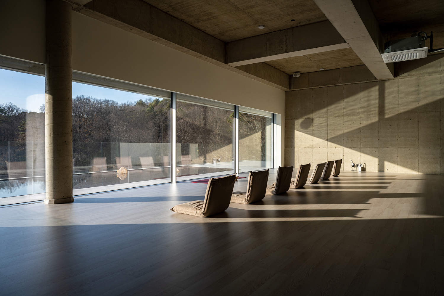 The first floor of the project is an interior space where the water feature on the terrace, along with the outdoor scenery, occupies the entire area. The terrace water feature serves as an outdoor relaxation space and provides reflected light to the interior over time, while the reflected light on the exposed concrete surface can be regarded as an internal element. This space is primarily used for activities such as yoga, meditation, and aromatherapy, providing visitors to Trebium with a sense of calm, as the owner wished. Many people who sit here quietly observing nature often experience a state of relaxation before drifting off to sleep.