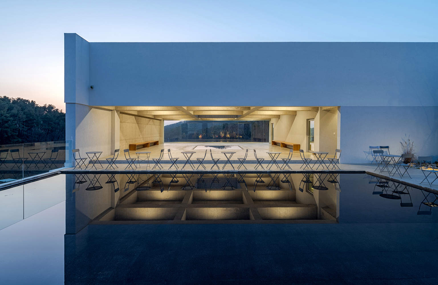 There is architecture created with attention to the natural environment and architectural principles. The client wanted a space of pure relaxation and emptiness, just like what nature can offer, with mountains, water, and sky becoming the primary themes throughout the design process. The owner named this place "TRIVIUM," aiming to convey the aesthetic of nothingness to visitors through these three natural elements. However, the challenge of infilling during the construction process was contradictory, similar to the wave-particle duality of light; building a structure themed around "reducing man-made structures" on a site that was originally only land and grass was not easy. The design process involved repeated collaboration with the owner, while focusing on a minimalist style to create a design solution that integrates nature into every space.