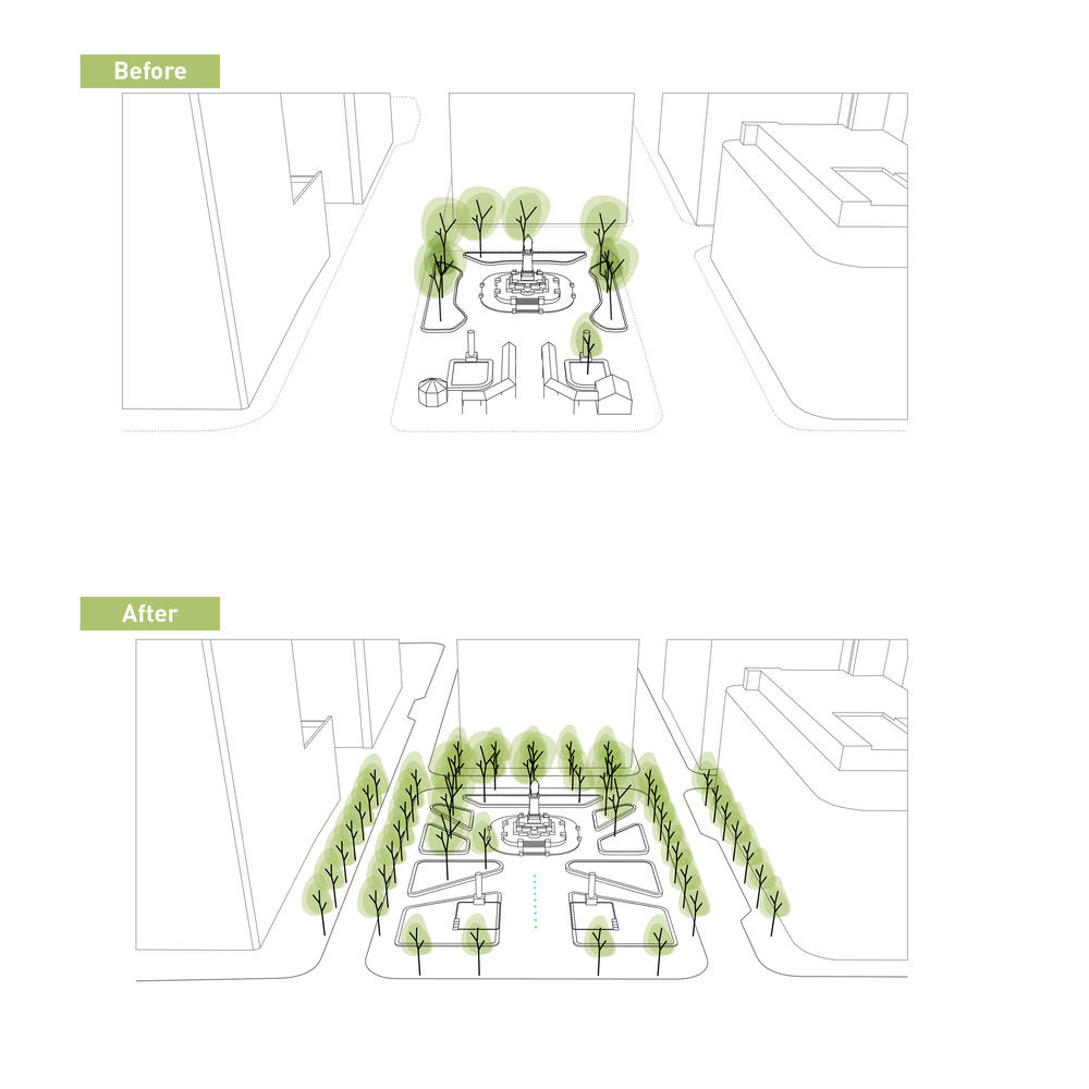 新的设计大大增加了该地区的绿化面积,提高了行人的体验,并打造了一个更具可持续性的城市领域。该项目增加了 46% 的植被,种植的树木数量是目前树木数量的 14 倍。Provencher_Roy 制定了一项绿化战略,其中包括因对城市污染的耐受性、耐寒性和恢复力而选择的五种树种,促进生物多样性,同时限制树木因病害而流失。沿着Sainte-Catherine St.,宽敞而连续的种植坑使树木能够充分发挥其潜力。在菲利普斯广场,现有的树木得到保护,沿边缘添加的新树木有助于塑造街道。为了唤起维多利亚时代的花园,郁郁葱葱的花坛与紫罗兰色、蓝色、粉红色和白色等柔和色调的粗糙植物并列。广场成为城市中的一片绿洲,其粗犷的自然主义美学与英式花园设计相呼应。