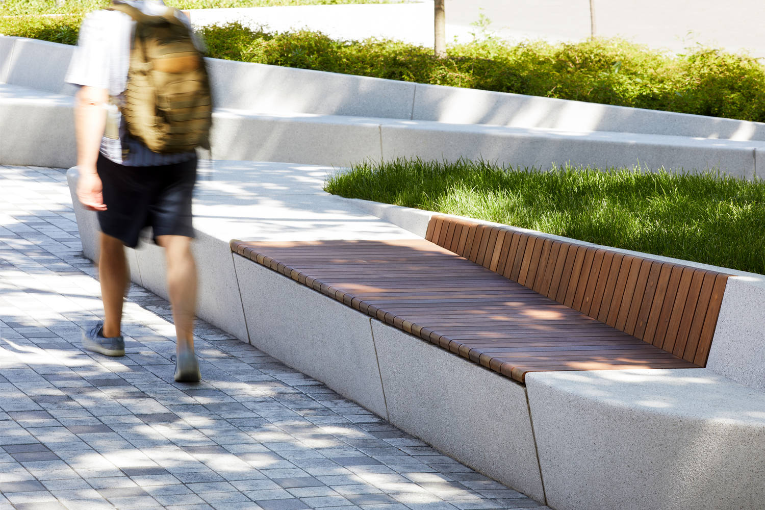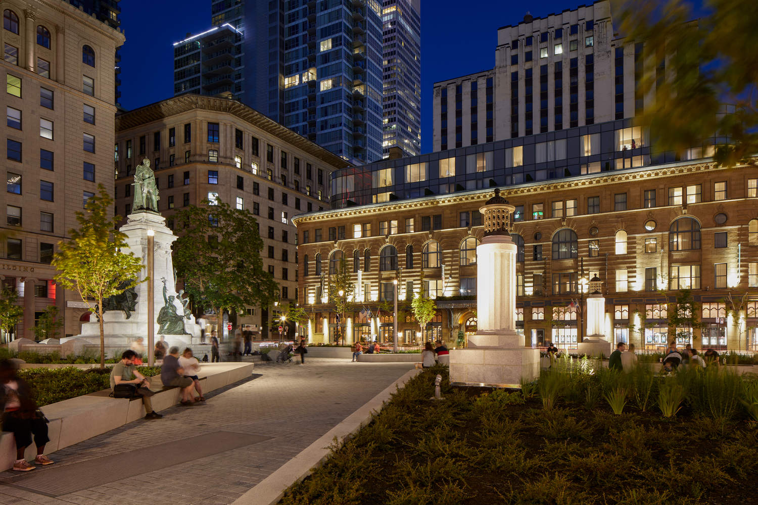 The design also realizes the vision set out in the 1841 Phillips Plan, which intended Phillips Square to be an integral part of the downtown core. As a modern interpretation of the English garden square, the space is newly expanded with wider sidewalks, lush vegetation, and clear sightlines that offer picturesque views of the built environment and the surrounding landscape. The Edward VII Monument, erected in 1914 following a donation by Henry Birks, is showcased by new lighting and surrounded by integrated urban furniture and a programmable water feature.