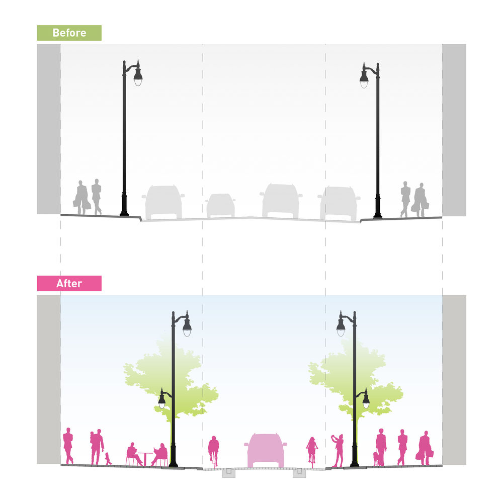 The design removed on-street parking and significantly widened the sidewalks, reversing the proportion of space allocated to cars and pedestrians and transforming it into a place for people. The new shared street creates a linear square that connects the previously disorganized network of squares, monuments, and historic buildings into a cohesive urban landscape. Bronze plates inlaid into the street act as urban markers, identifying the grand department stores and commercial buildings from the turn of the century that made the area a legendary heritage site.