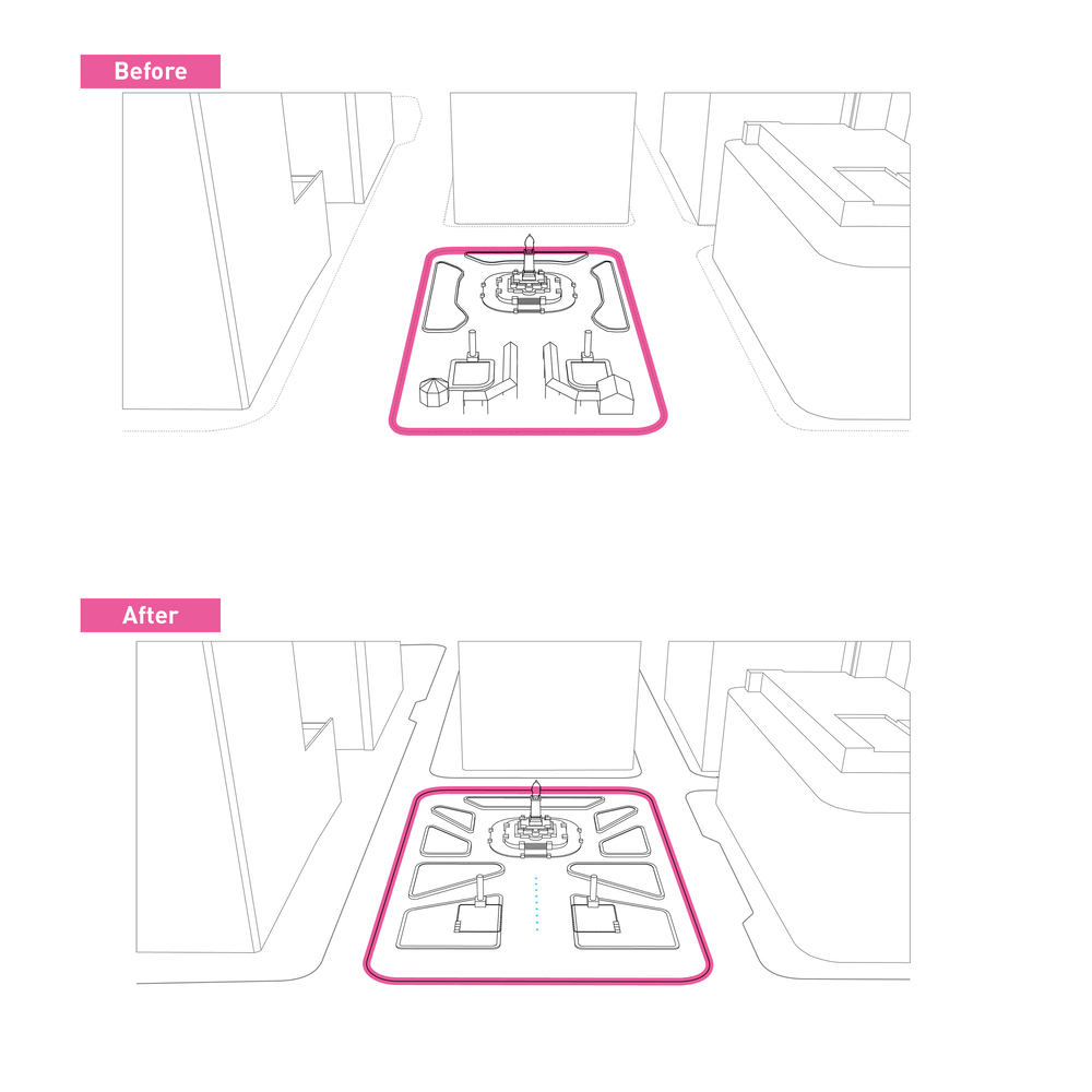 The new paving uses modular pavers to delineate different spaces and their functions. Ranging from dark grey to light grey, the pavement informs pedestrians of the presence of vehicular lanes or safe pedestrian-only areas. The changing colours emphasize which areas are exclusively for walking and which are shared by cars and cyclists, creating a sense of security while maintaining a cohesive and unified public space.