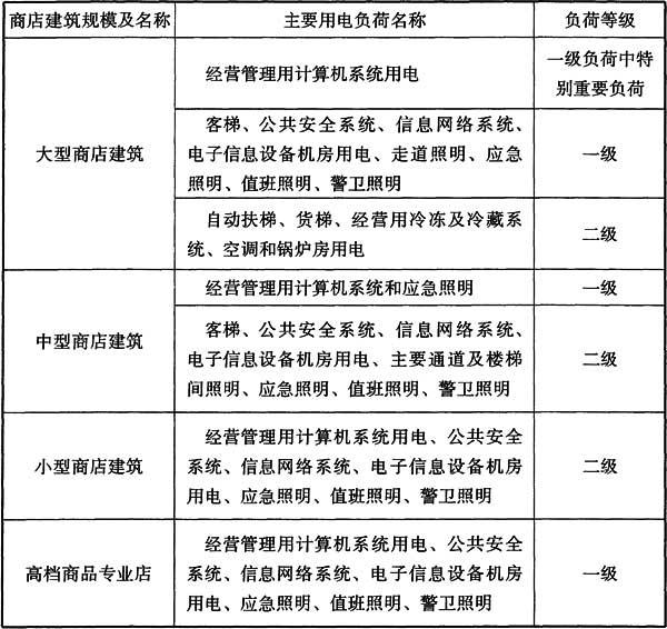 3.3.1 商店建筑用电负荷的分级可根据商店建筑及配套设施的性质、电气负荷重要性和中断供电所造成的损失程度进行划分。