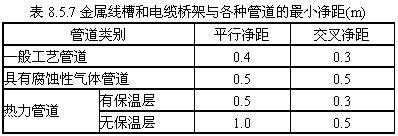24.9.7电缆桥架与热管道平行敷设时,距热管道保温层外表面的净距,不宜少于500mm;交叉敷设时,不宜少于300mm。