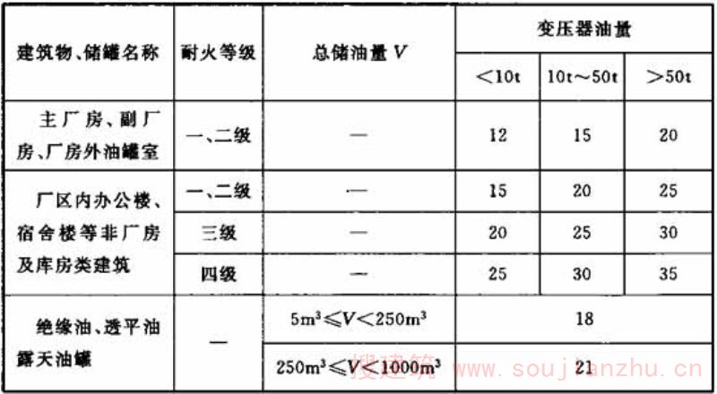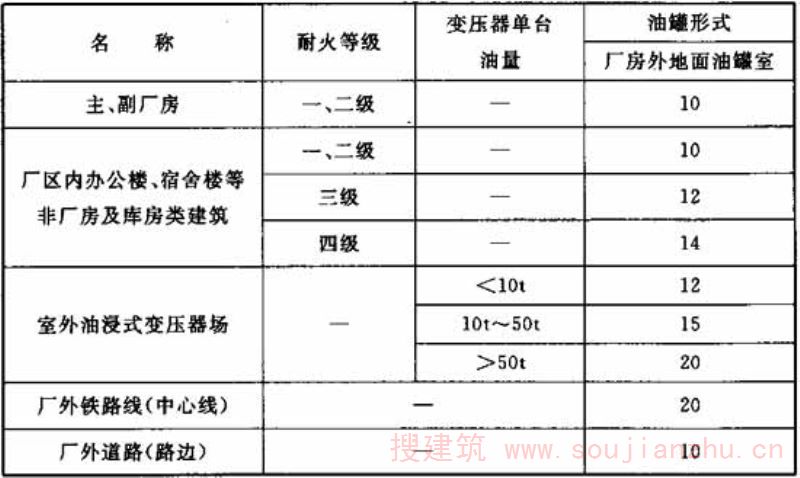 表4.0.3 室外油浸式变压器与厂区建筑物、绝缘油和透平油露天油罐的防火间距(m)