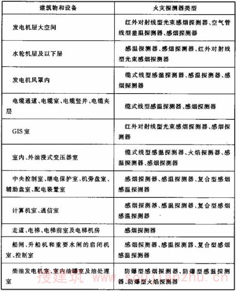 13.3.5根据现阶段国内水电工程的工作环境,用于水电工程的火灾自动报警装置设备和用于一般的工业建筑环境的火灾报警装置设备比较,需要满足某些特殊的环境技术要求。例如水轮发电机和油浸式主变压器采用的火灾探测器应能够抗电磁场的干扰,蓄电池室、透平油库采用的火灾探测器需要有防爆能力,电缆廊道内采用的火灾探测器应具有防潮功能等。另外,在装有联动设备、自动灭火系统以及用单一火灾探测器不能有效确认火灾的场合,可采用同类或不同类型的火灾探测器的组合设置。所以,对于水电工程火灾报警系统探测设备的选择,应该充分考虑被保护对象的火灾特性、使用环境、安装条件及满足的功能,进行全面综合的设计。 表2所列火灾探测器的选择可作为火灾报警系统设计时的参考。 表2火灾探测器的选择