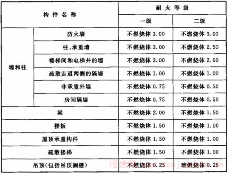 3.0.2对于水电工程建(构)筑物构件的燃烧性能和耐火极限,考虑到建筑主体一般为钢筋混凝土结构,基本符合一级或二级耐火等级要求。三级耐火等级的砖木结构在大中型水电工程中已不再使用。依据现行国家标准《建筑设计防火规范》GB50016,针对水电工程具体情况,将水电工程建(构)筑物构件的耐火等级规定为一级和二级。 本规范表3.0.2系参考《建筑设计防火规范》GB50016-2006表3.2.1,列出了两个耐火等级构件的燃烧性能和耐火极限的具体规定。其中防火墙、柱、楼梯间和电梯井的墙、屋顶承重构件的规定,参考了《建筑设计防火规范》GB50016-2006中的数据。 对于高度超过13m的屋顶金属承重结构,不再进行防火保护,系参照《建筑设计防火规范》GB50016-2006中第3.2.4条和水电站厂房的具体情况确定的。