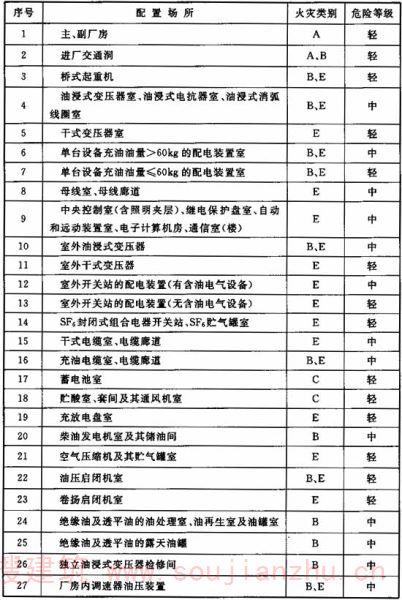 3.0.1本规范依据现行国家标准《建筑设计防火规范》GB50016确定的原则,并结合水电的行业特点和具体情况,对水电工程生产场所的火灾危险性类别作出相应规定。 水电工程厂房中大部分生产场所火灾危险性较低,只有少量丙类场所。根据水电工程厂房的实际情况,确定主副厂房为丁类,而局部场所可以按实际情况确定其类别。 考虑到在生产过程中不存在现行国家标准《建筑设计防火规范》GB50016中规定的甲类和乙类生产火灾危险性类别场所,本规范中只划分生产场所中丙、丁和戊类三个火灾危险性类别。如有汽油油库、氧气瓶仓库等,则应按现行国家标准《建筑设计防火规范》GB50016的规定执行。 关于规范中表3.0.1生产场所的火灾危险性类别的说明: (1)主厂房、副厂房、屋内开关站。厂房是水电工程最主要的生产建筑物,一般包括主厂房、副厂房及屋内开关站。按其生产特点,主厂房、副厂房及屋内开关站没有甲类和乙类生产火灾危险性场所,包含有少量丙类生产火灾危险性场所。例如油浸变压器室、绝缘油及透平油油罐室、油浸式电抗器室等。但这类场所仅占整个厂房很少一部分,并采用防火墙或防火隔墙、楼板和防火门进行了局部分隔,并按要求配备了相应的消防设施。因此在发生火情时,能阻止火灾的蔓延。根据《建筑设计防火规范》GB50016-2006第3.1.1条的原则,本规范规定水电工程的主厂房、副厂房和屋内开关站的生产火灾危险性类别为丁类。 (2)变压器室。油浸式变压器绝缘油闪点在130℃以上,属于闪点大于60℃的丙类液体,使用这类绝缘油的油浸变压器房间属丙类火灾危险性场所。油浸式电抗器室、油浸式消弧线圈室、独立设置的变压器检修间也属于这种情况。 干式变压器采用难燃绝缘材料,不含绝缘油,其房间属丁类火灾危险性场所。 (3)配电装置室。配电装置室(含发电机电压配电装置及其他高压配电装置)内,按单台设备充油量大于或小于等于60kg将其划分为丙类或丁类火灾危险性场所。该规定使本规范与现行国家标准《建筑设计防火规范》GB50016和《火力发电厂与变电站设计防火规范》GB50229执行的标准一致。 (4)继电保护和自动装置类设备场所。在水电工程内,这类场所主要包括继电保护盘室、辅助盘室、通信室和电子计算机房等。这些场所是水电工程的控制中枢,其安全关系到整个供电系统能否正常运行。该类场所电气线路较多,存在电气火灾的可能性,同时也是电站人员活动较集中处。综合各种因素,将其划分为丙类火灾危险性场所。 (5)SF6封闭式组合电器开关站和SF6贮气罐室。SF6本身属不可燃气体,在常温下理化性质十分稳定。SF6绝缘电气设备本体其他部分亦由不燃材料制成,因此划分为丁类火灾危险性场所。 (6)动力电缆和控制电缆场所。水电工程采用的电缆种类多,数量大。从火灾危险性来讲,目前一般采用的电缆,当其单根移开火源后一般不会继续燃烧,但当电缆数量较多时,一旦起火火势仍会蔓延。因此,在电缆室(夹层)和电缆通道(含电缆隧道、竖井)中架空敷设的电缆火灾危险性较大,在本规范中划分为丙类。 当采用阻燃电缆(在其绝缘和保护层材料中添加阻燃剂,着火后具有不易延燃或自燃特性),或在普通电缆上采用了阻止延燃措施时,其火灾危险性等级可以适当降低。 (7)蓄电池室及配套房间。国家水电工程中主要采用防酸隔爆型铅酸蓄电池,这类蓄电池在结构上采取了密封和消氢措施,但在运行中仍可能有少量氢气逸出。故这类蓄电池室划为丙类火灾危险性场所。 碱性蓄电池和阀控式蓄电池室,按其性能划为丁类火灾危险性场所。 与蓄电池室配套布置的酸室、套间及通风机室,一般都设在蓄电池室旁边。这些辅助房间的火灾危险性类别应按相应蓄电池室对待。