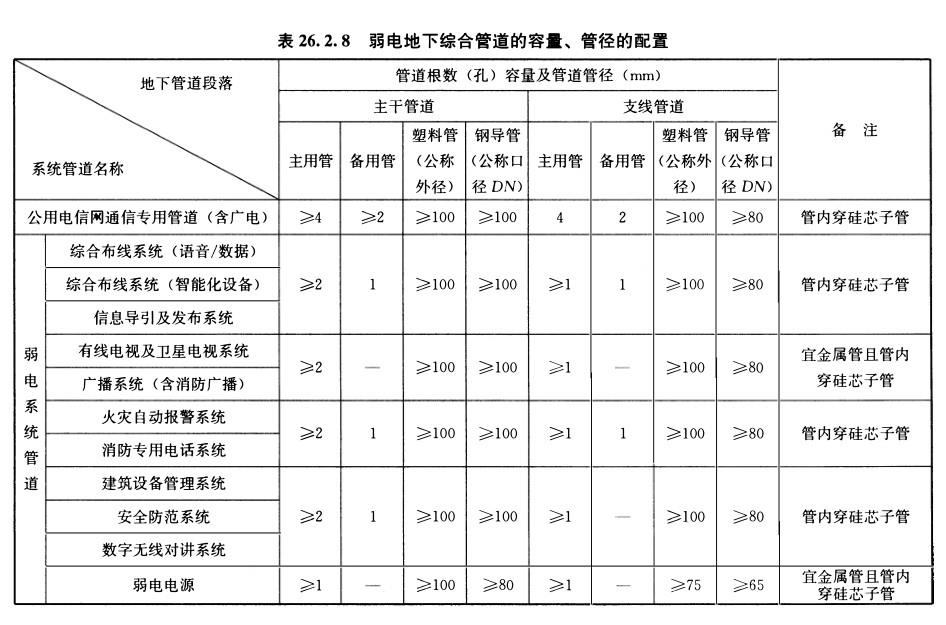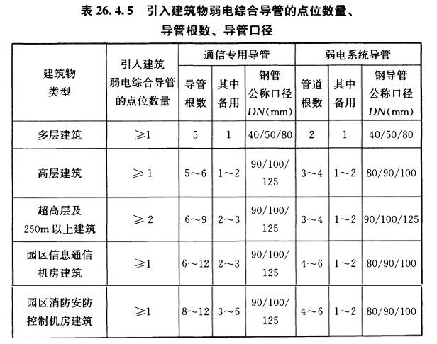 26.4.8直接引入建筑物地下室的弱电终端设备用户管宜采用多根公称口径为25mm~50mm的热浸锁锌焊接钢导管,并应在地下室外墙上采取止水措施。