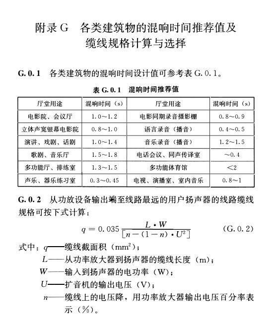 附录G 各类建筑物的混响时间推荐值及缆线规格计算与选择