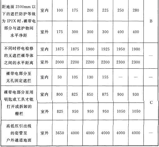 6.4.3 在变压器室和配电室内裸导体上方布置灯具时,要考虑不停电更换灯泡时的人身安全。人的水平伸臂长度一般不超过0.9m,且配电室是电气专用房间,更换灯泡人员为电气工作人员,因此规定灯具与裸导体的水平净距大于1.0m是安全的。