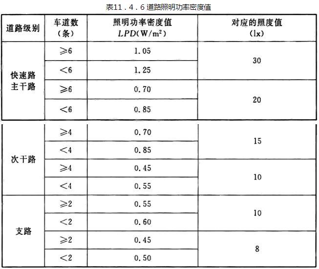 11.4.6 照明功率密度(LPD)是道路照明节能的量化指标之一。
