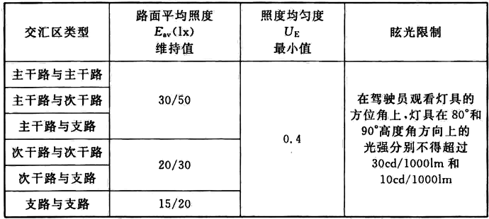 2 表中对每一类道路交汇区的路面平均照度给出了两档标准值,“/”的左侧为低档照度值,右侧为高档照度值。