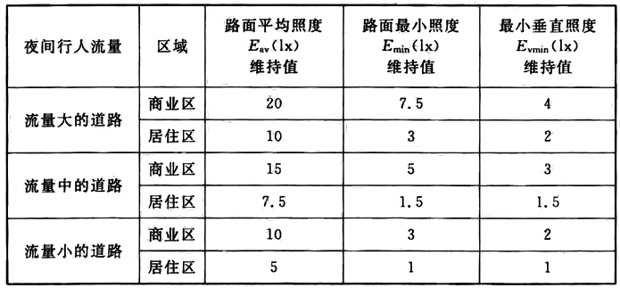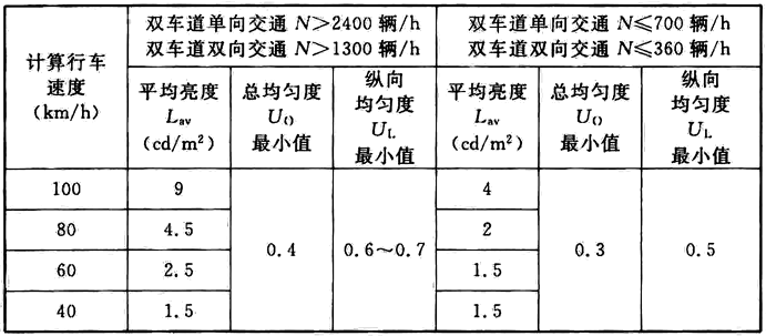 注:当交通量在其中间值时,亮度指标按表中高值的80%取值;均匀度指标按内插法取值。