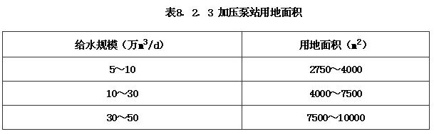 8.2.3 加压泵站用地应按给水规模确定,用地形状应满足功能布局要求,其用地面积宜按表8.2.3采用。泵站周围应设置宽度不小于10m的绿化带,并宜与城市绿化用地相结合。