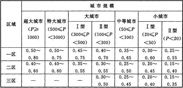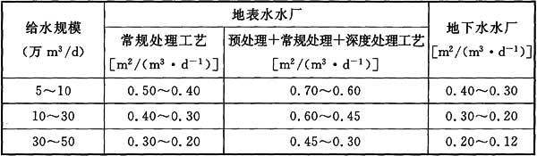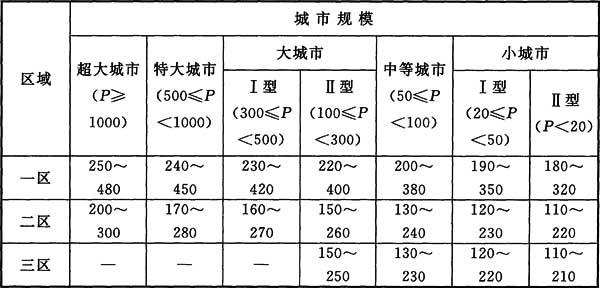 注:1 给水规模大的取下限,给水规模小的取上限,中间值采用插入法确定。