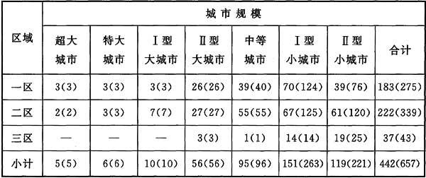 4.0.3 城市规模分类依据国务院《关于调整城市规模划分标准的通知》(国发[2014]51号):以城区常住人口为统计口径,将城市划分为五类七档。城区常住人口50万以下的城市为小城市,其中20万以上50万以下的城市为Ⅰ型小城市,20万以下的城市为Ⅱ型小城市;城区常住人口50万以上100万以下的城市为中等城市;城区常住人口100万以上500万以下的城市为大城市,其中300万以上500万以下的城市为Ⅰ型大城市,100万以上300万以下的城市为Ⅱ型大城市;城区常住人口500万以上1000万以下的城市为特大城市;城区常住人口1000万以上的城市为超大城市(以上包括本数,以下不包括本数)。