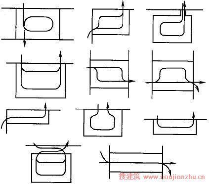 地面停车场内部交通组织方式主要有回环式、直通式、迂回式等11种形式(附图1),设计时宜采用单向交通组织,以减少内部车辆交织,提高运行安全性;自走式地上停车楼和(或)地下停车库的交通组织主要有单斜路中央型、单斜路半边型等11种形式(附图2),应根据多层停车库的层数及内部布局选择适当的形式,确保交通安全。