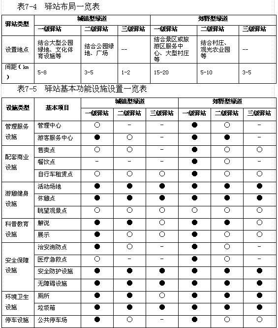 3.驿站设置应优先利用现有建筑。新建建筑应注意控制尺度和体量,建筑层数以1-2层为宜,建筑风格应与周边环境相适应。一级驿站宜结合交通接驳点进行设置;二级驿站宜依托重要串联节点进行设置,三级驿站设置可根据功能需要灵活设置。驿站布局及设施设置详见表7-4驿站布局一览表,表7-5驿站基本功能设施设置一览表。