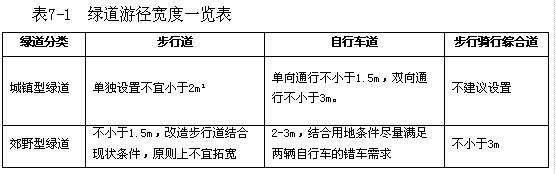 不同类型绿道游径宽度应根据绿道使用频率,因地制宜、灵活控制,绿道游径最小宽度应符合表7-1规定。