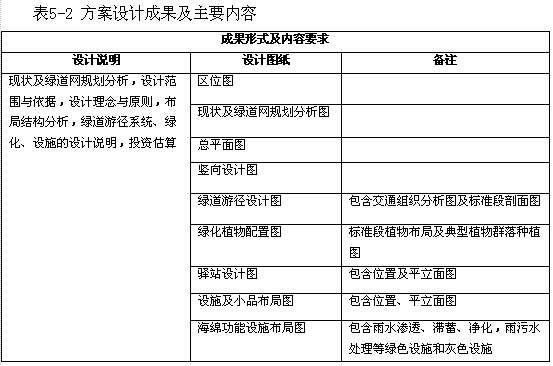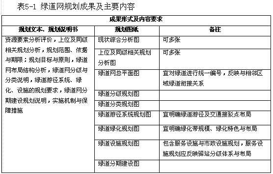 5.2.2 绿道网规划成果应包括规划文本、规划说明书、规划图纸三个部分。规划主要内容和成果要求详见表5-1。
