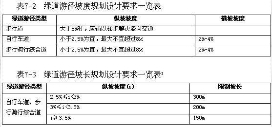 绿道游径纵坡宜尽量与现状自然地形相结合,横坡宜坡向绿化带。针对不同类型的绿道游径,其坡度的设计范围可按照表7-2的相关要求。自行车道坡度大于等于2.5%时,应按表7-3规定限制坡长。