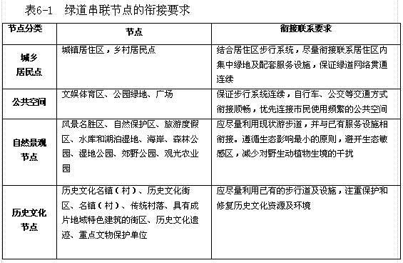 6.1.2 应就近联系各级城乡居民点及公共空间,方便市民使用;同时尽可能连接自然景观及历史文化节点,体现地域特色。绿道串联节点的衔接要求详见表6-1。
