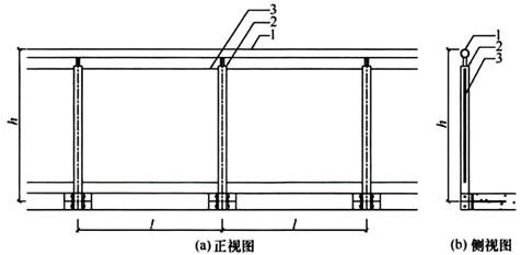 图1 正装式防护栏杆示意 1-扶手;2-立柱;3-栏板;l-立柱间距;h-防护栏杆高度
