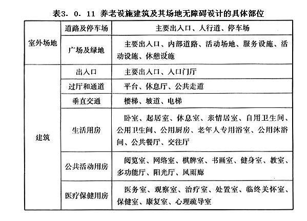 3.0.11 养老设施建筑及其场地均应进行无障碍设计,并应符合现行国家标准《无障碍设计规范》GB 50763的规定,无障碍设计具体部位应符合表3.0.11的规定。
