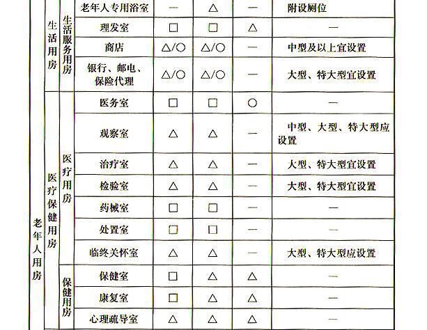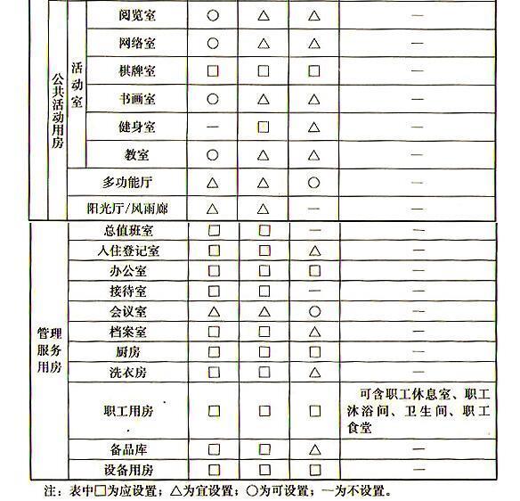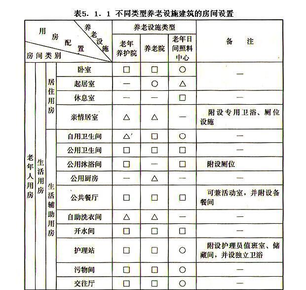 5.1.1养老设施建筑应设置老年人用房和管理服务用房,其中老年人用房应包括生活用房、医疗保健用房、公共活动用房。不同类型养老设施建筑的房间设置宜符合表5.1.1的规定。