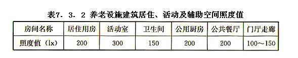 7.3.2 养老设施建筑居住、活动及辅助空间照度值应符合表7.3.2的规定,光源宜选用暖色节能光源,显色指数宜大于80,眩光指数宜小于19。
