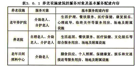 3.0.1 本条规定了养老设施的服务对象及基本服务配置。需要强调的是,养老设施的服务配置应当在适应当前、预留发展、因地制宜的原则指导下,在满足服务功能和社会需求基础上,尽可能综合布设并充分利用社会公共设施。