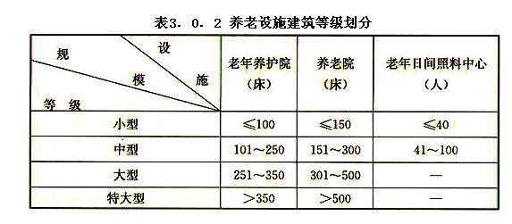 3.0.2 根据我国民政部颁布的现行行业标准《老年人社会福利机构基本规范》MZ 008,以及建设标准《老年养护院建设标准》建标144-2010、《社区老年人日间照料中心建设标准》建标143-2010,养老设施可以根据配建和设施规模划分等级。国家和各地的民政部门在养老设施管理规定中将提供居养和护理的养老机构按床位数分级,以便于配置人员和设施。因此,建设标准主要满足养老设施的规划建设和项目投资的需要。本规范根据现行国家标准《城镇老年人设施规划规范》GB 50437分级设置的规定,并参考国内外养老机构的建设情况,根据养老设施建筑用房配置要求将养老设施中的老年养护院和养老院按其床位数量分为小型、中型、大型和特大型四个等级,主要满足建筑设计的最低技术指标。老年日间照料中心按照社区人口规模10000人~15000人、15000人~30000人、30000人~50000人分为小型、中型和大型三个等级,按照2015年全国老龄化水平的预测值15.3%,并根据小型、中型和大型的社区老年人日间照料中心的建筑面积分别按照老年人人均房屋建筑面积0.26㎡、0.32㎡、0.39m2进行估算,则三类的面积规模分别为300㎡~800㎡、800㎡~1400㎡、1400㎡~2000㎡。同时根据现行国家标准《城镇老年人设施规划规范》GB 50437中对托老所的配建规模及要求,托老所不应小于10床位,每床建筑面积不应小于20㎡。综合以上因素,考虑到老年人日间照料中心多为社区层面的养老设施,且应与其他养老设施的等级划分相协调,因此本规范将老年日间照料中心确定小型和中型两个等级,分别为小于或等于40人和41人~100人。
