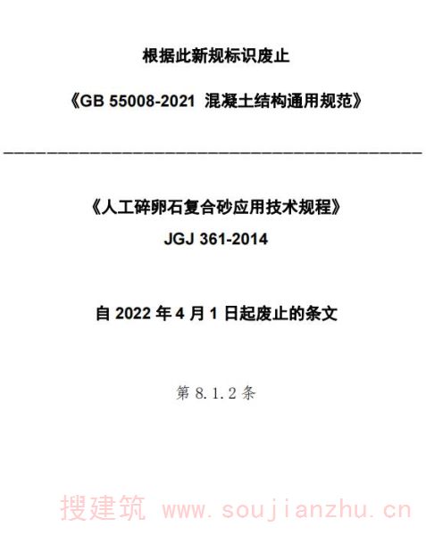 现批准《人工碎卵石复合砂应用技术规程》为行业标准,编号为JGJ 361-2014,自2015年8月1日起实施。其中,第8.1.2条为强制性条文,必须严格执行。