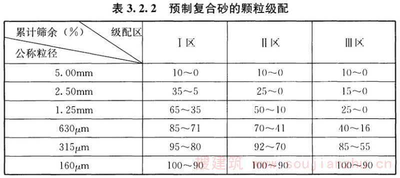 3.2.2 预制复合砂颗粒级配的技术要求根据现行行业标准《普通混凝土用砂、石质量及检验方法标准》JGJ 52的规定制定。