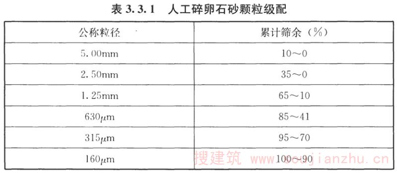 1 人工碎卵石砂的颗粒级配宜符合表3.3.1的规定;其石粉含量、压碎值指标、有害物质含量、碱活性及氯离子含量应符合现行行业标准《普通混凝土用砂、石质量及检验方法标准》JGJ 52的规定。