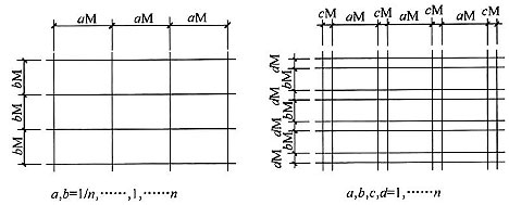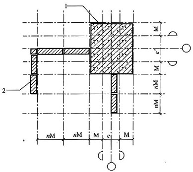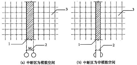 3 模数网格间可用中断区调整两个或两个以上模数网格之间的关系,网格中断区可是模数的,也可是非模数的(图4.4.2-1、图4.4.2-2)。