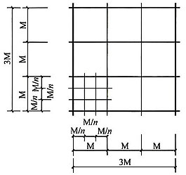 5.2.2 当主体结构尺寸和模数装修网格不一致时,装修网格可被分隔为若干空间。模数结构网格和模数装修网格、不同尺寸模数网格宜适当叠加设置(图5.2.2)。