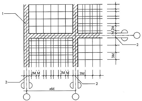 1—水平部件;2—垂直部件(承重支点);3—非模数间隔中断区