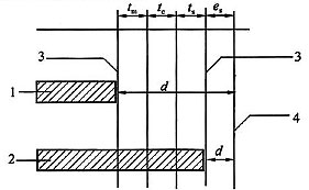 1 部件的安装位置与基准面之间的距离(d),应满足公差与配合的状况,且应大于或等于连接空间尺寸,并应小于或等于制作公差(t m )、安装公差(t e )、位形公差(t s )和连接公差(e s )的总和,且连接公差(e s )的最小尺寸可为0(图4.5.2)。