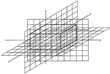 用于部件定位的,由正交或斜交的平行基准线(面)构成的平面或空间网格,且基准线(面)之间的距离符合模数协调要求。